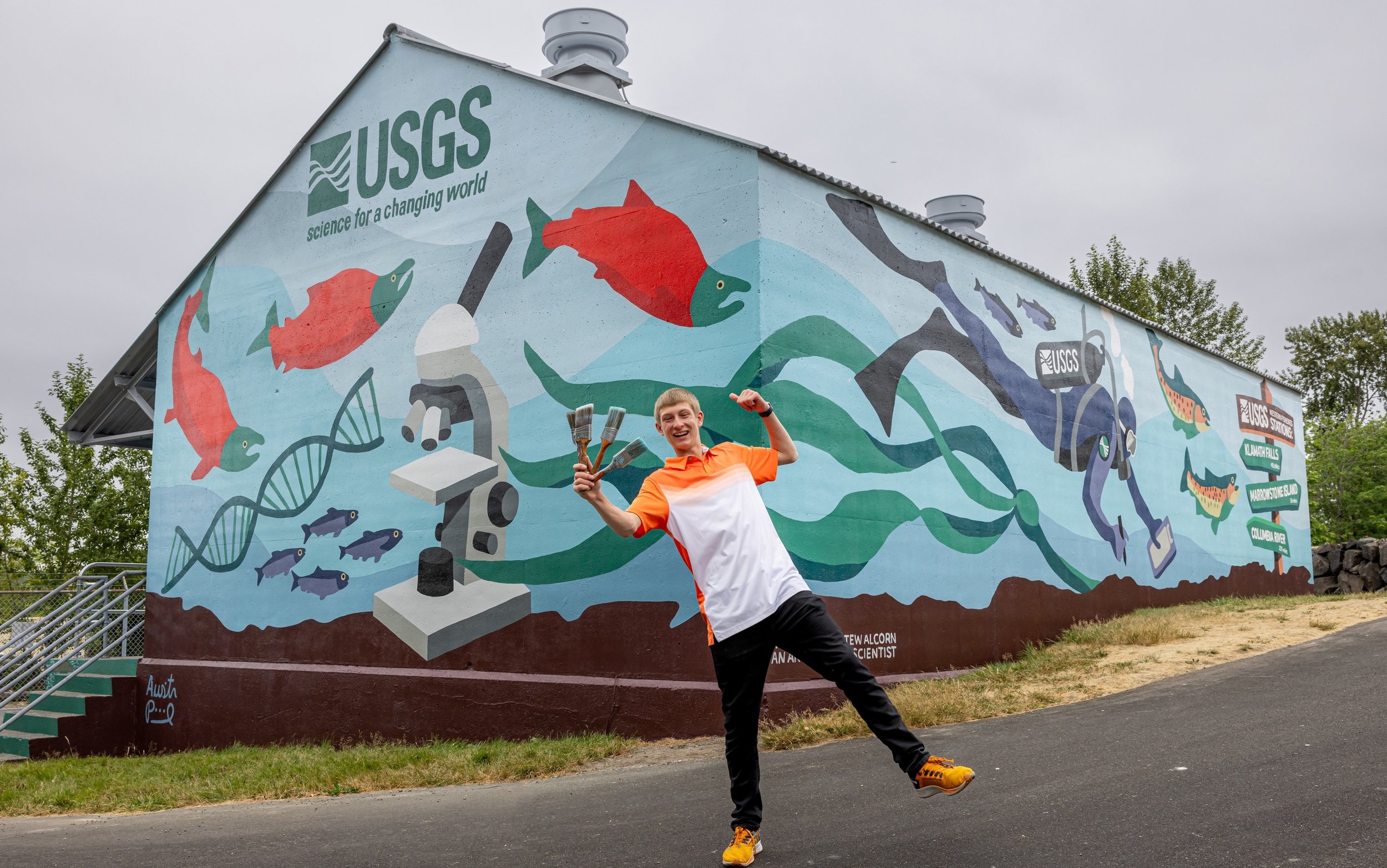 I’m the artist behind the Save Our Salmon (SOS) Mural Series. So far, I’ve led 700 volunteers painting a 400 feet of Save Our Salmon Murals at Seattle-area salmon-spawning streams - Juanita Creek, McAleer Creek, and the Western Fisheries Research Center.